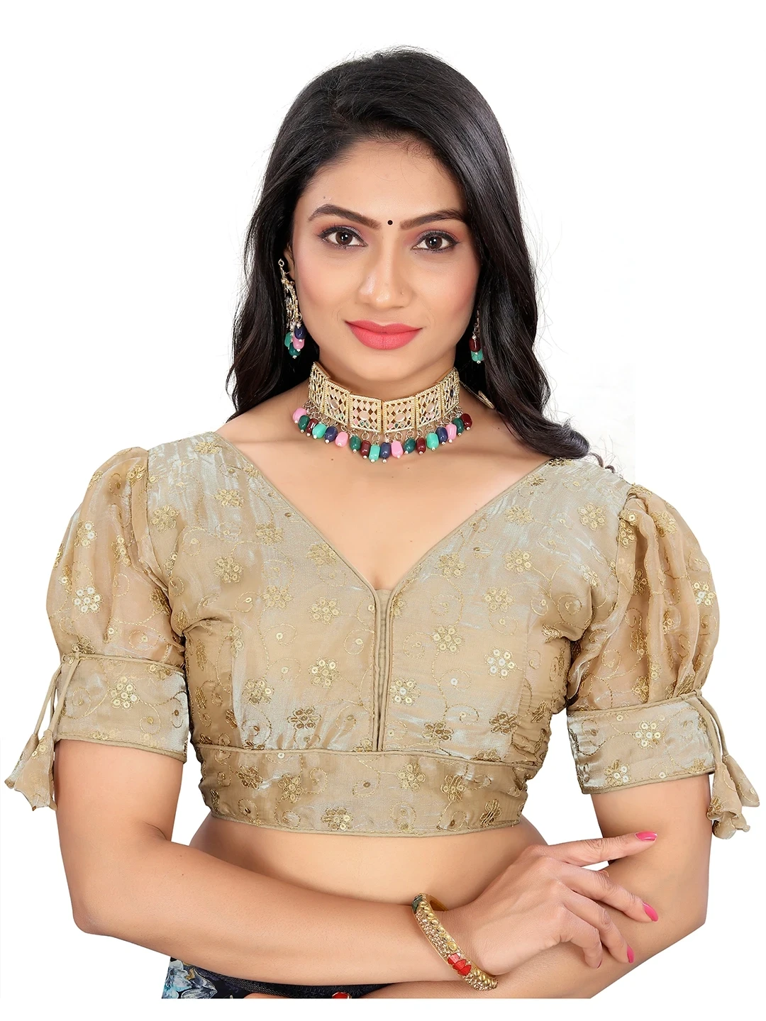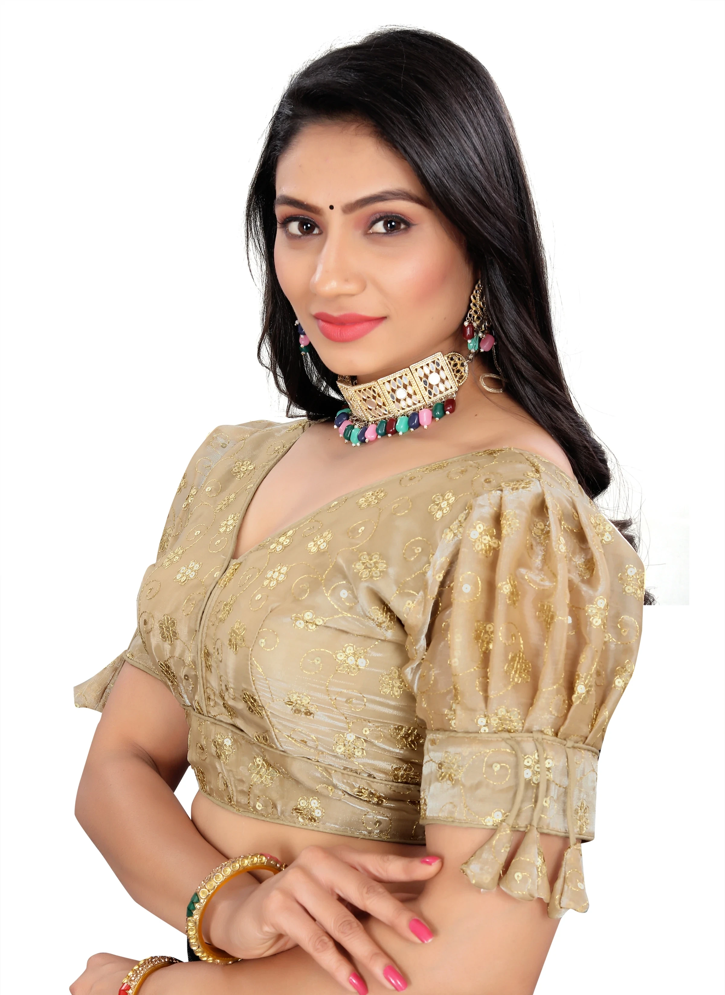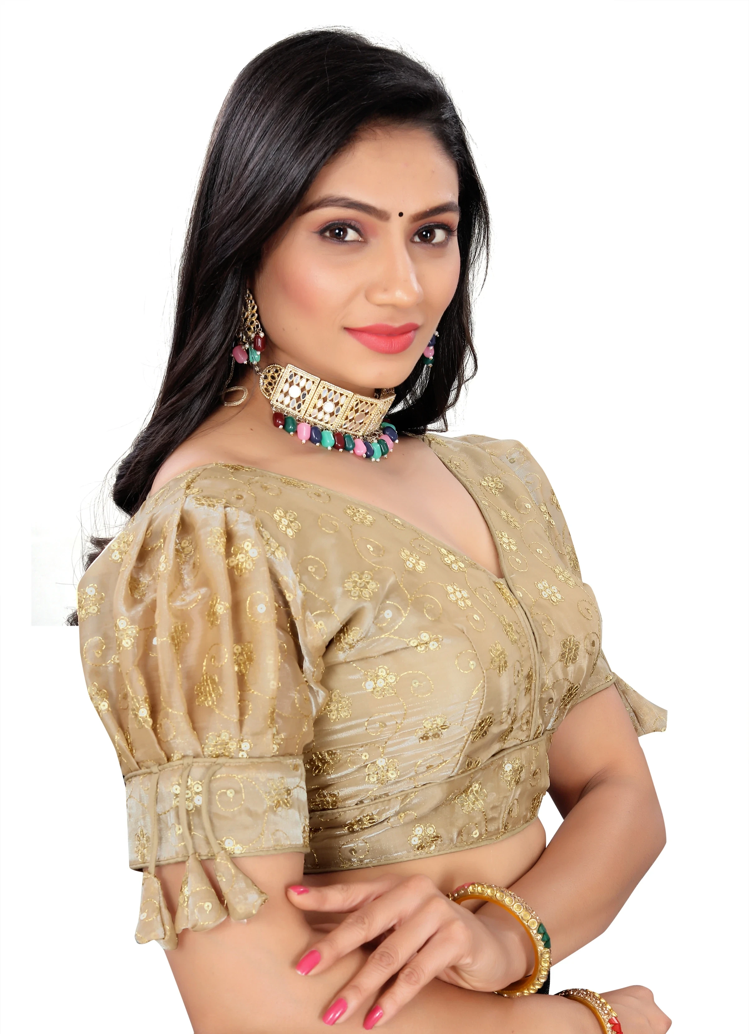 Reeta Fashion Golden Heavy Zimichoo Fancy Balloon Sleeves With 3 Julla Readymade Blouse